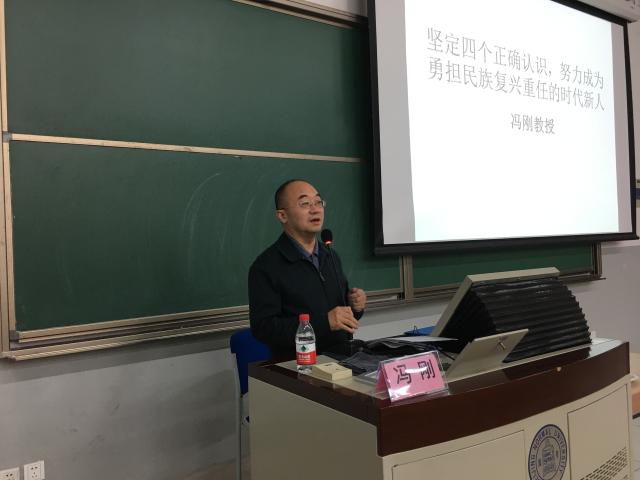 冯刚教授首先跟大家介绍了习近平总书记在全国高校思想政治工作会议上所强调的高校思想政治工作要教育引导大学生树立的“四个正确认识”的具体内容,并结合自己的求学和教学经历,深入浅出地为大家阐述了如何正确理解“四个正确认识”,指出这“四个正确认识”是我们努力成为勇担民族复兴重任的时代新人的关键问题,要加入党组织的同学更应该认真思考如何解决好“四个正确认识”的问题。