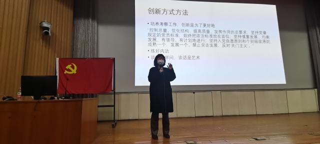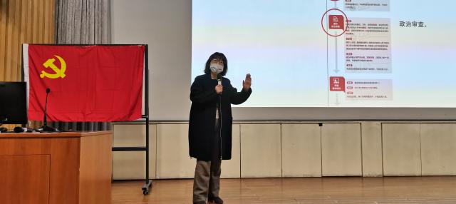 大会第二项,孙宇老师进行主题讲座。首先,孙宇老师强调,党建工作是一项专业性工作,也是一项经常性重要工作。因此,党员和入党积极分子需要做到如下两点:一是要谙熟制度,不断学习《中国共产党党员发展细则》来提高政治素养,同时要充分意识到执行是制度的生命力,坚定不移地执行制度规范。二是要明确任务要求,牢记发展党员工作流程。